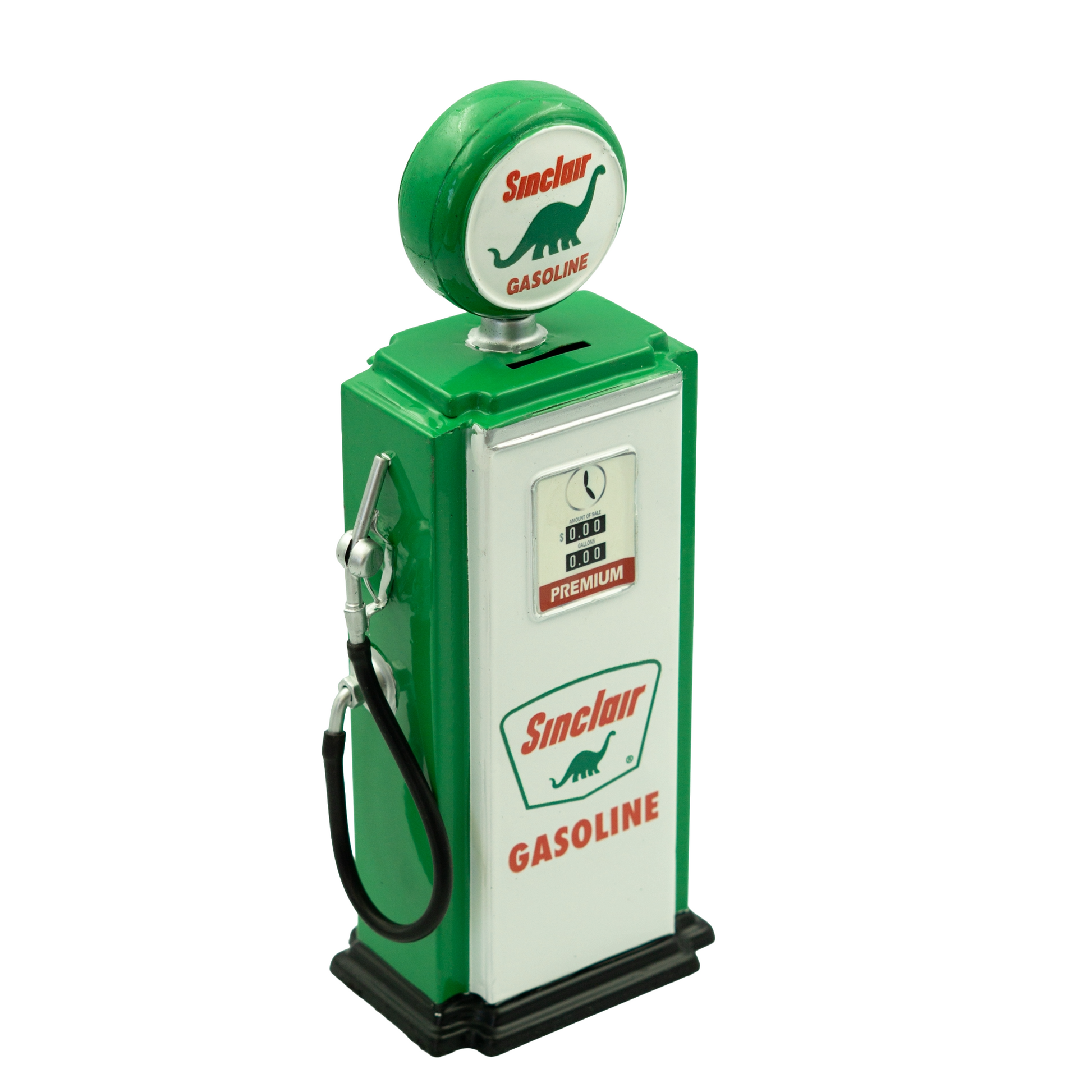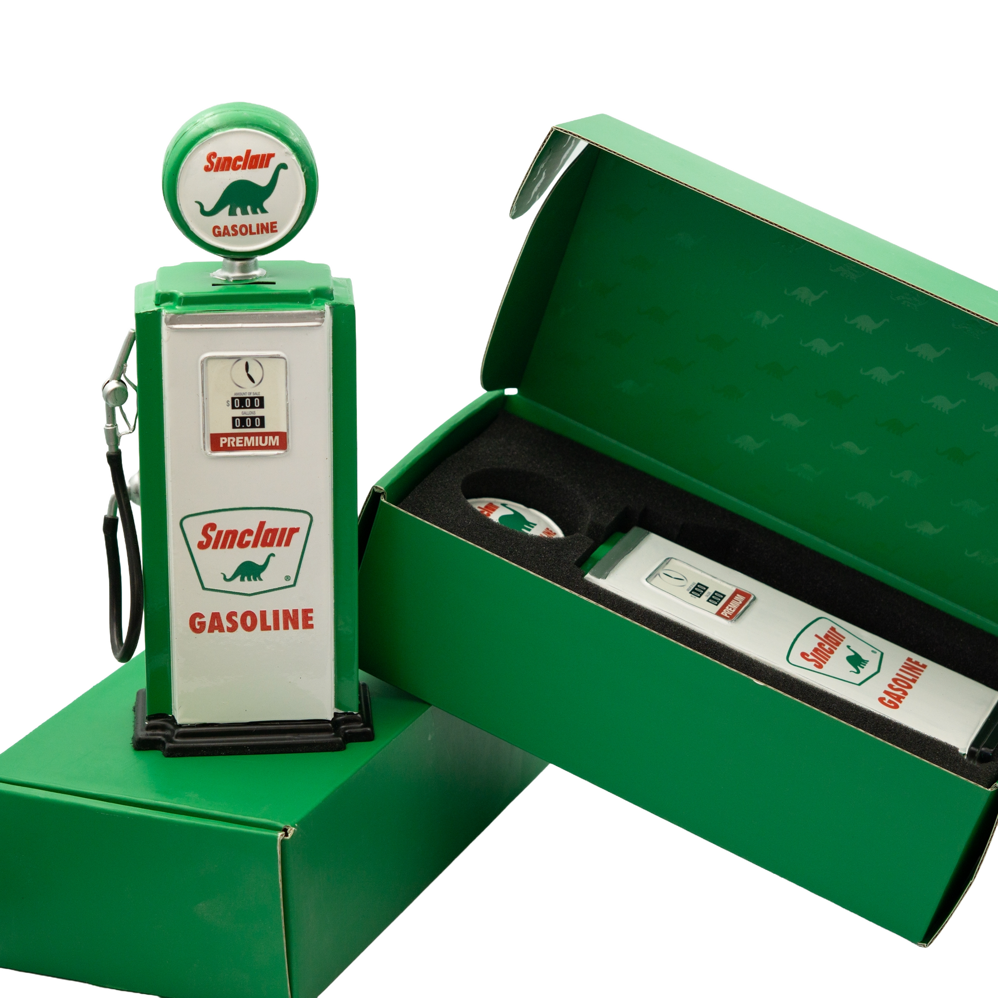 Add a touch of vintage charm to your space with this nostalgic Sinclair gas pump coin bank, complete with a custom box. Modeled after the classic pumps of yesteryear, it’s the perfect blend of function and retro appeal. Whether you're collecting spare change or expanding your retro memorabilia collection, this unique piece is a standout.