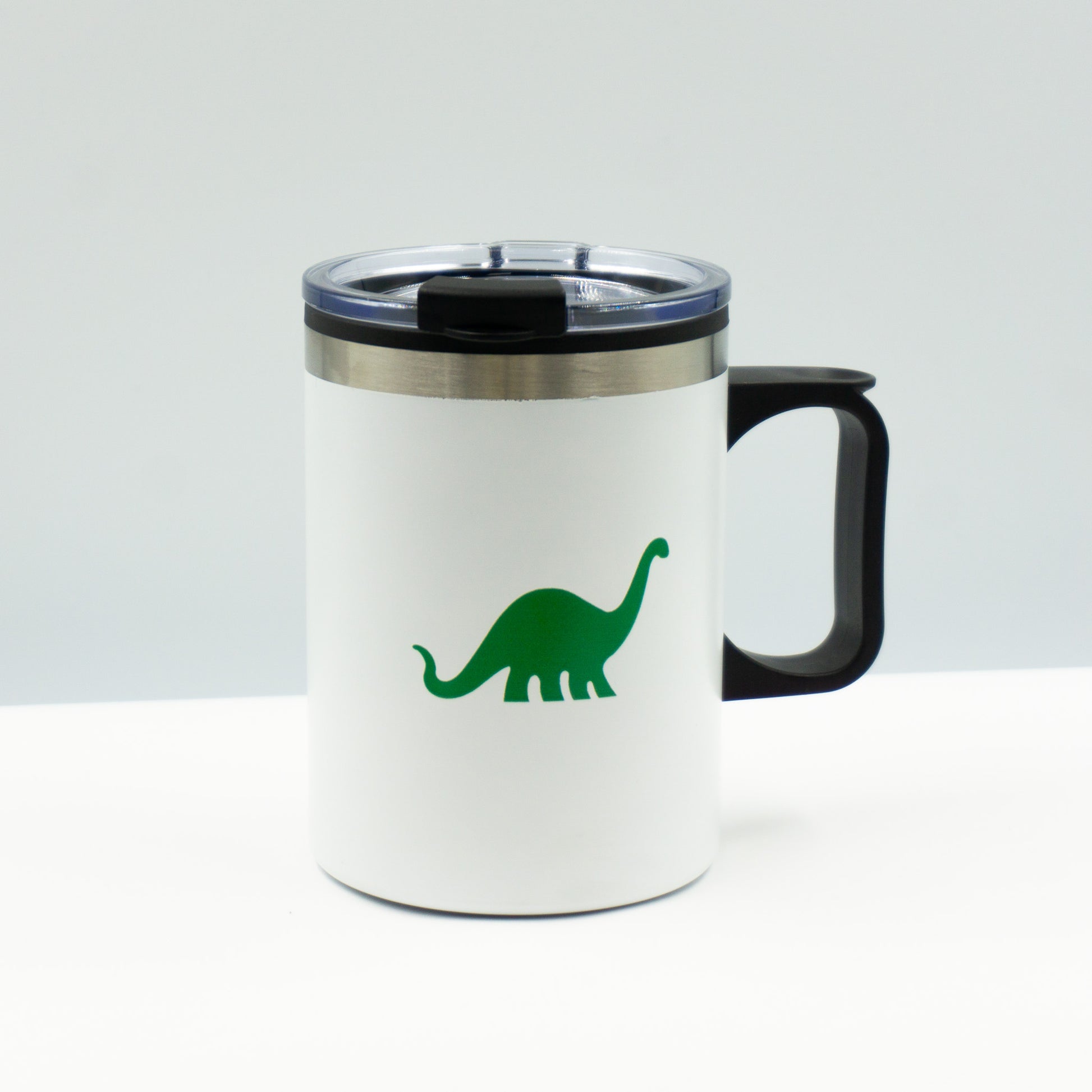 The charming green dinosaur graphic adds a playful touch, whether you're brewing at a campsite or sipping at your desk.
